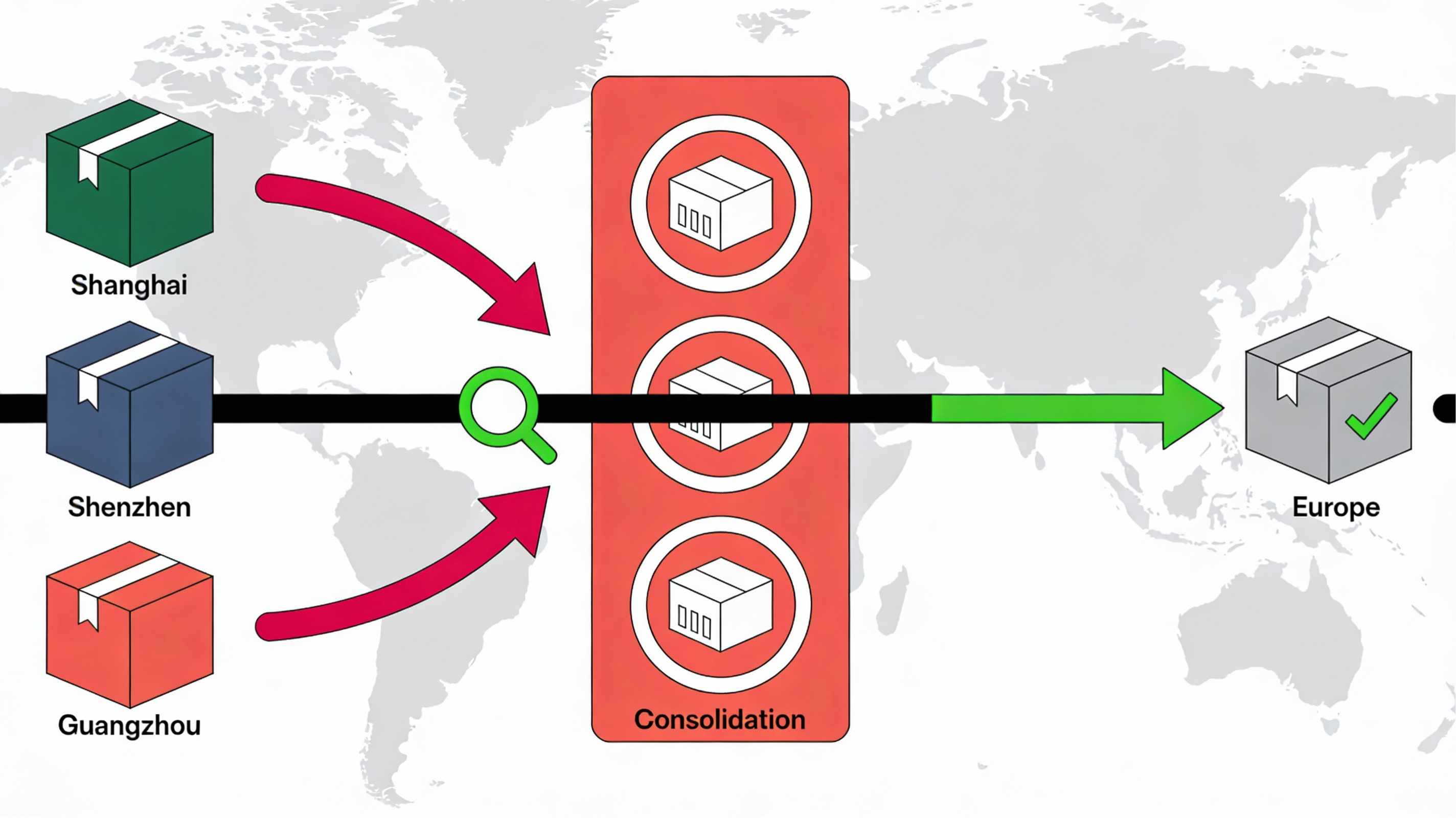 Maîtrise logistique Chine : entrepôts, contrôle qualité, consolidation, pilotage bout en bout jusqu'à Europe. Rassurance maximale.